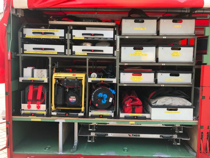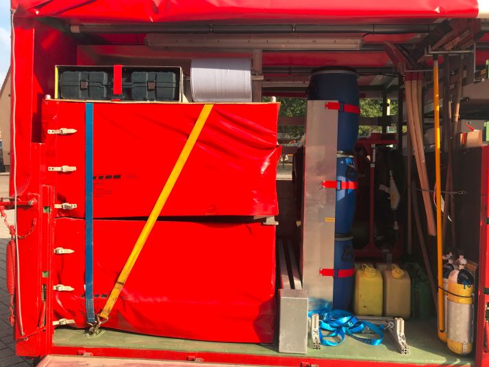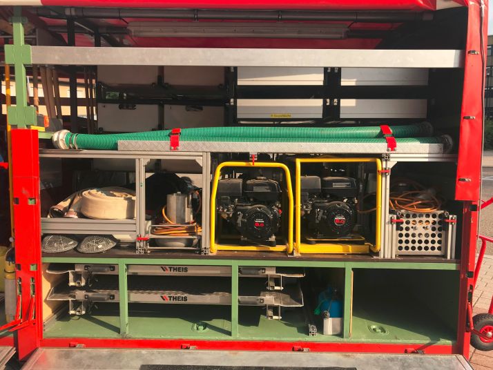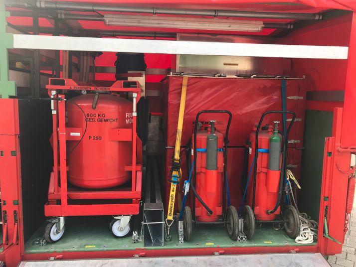 Schmutzwasserpumpen, Agreggate, Pulverlöscher, Ölsperren, Rettungszelt, Feuerlöscher PG250, 3x PG 50, Eisenbahnlohren, Faltbehälter mit Zubehör, Gefahrstoffumfüllpumpe, Löschlanzen, Beleuchtung, Sackkarre, Auffangfässer, Ölbinder, Absicherungsmaterial, Werkzeuge, Schutzausrüstung,